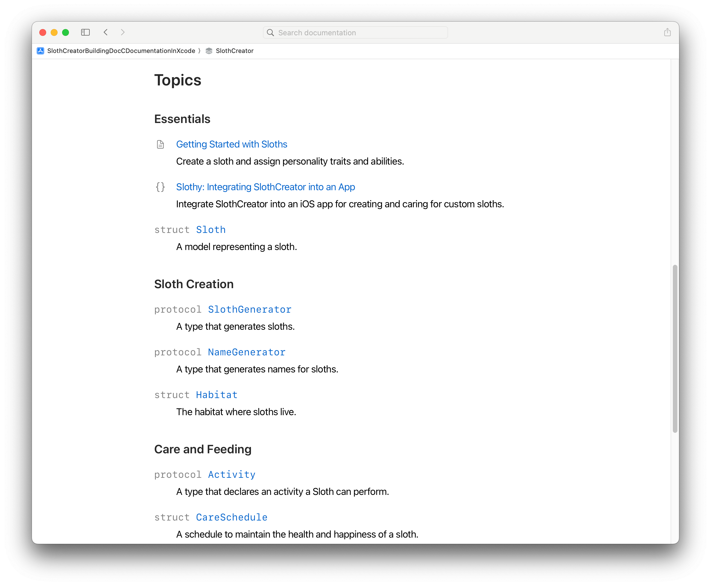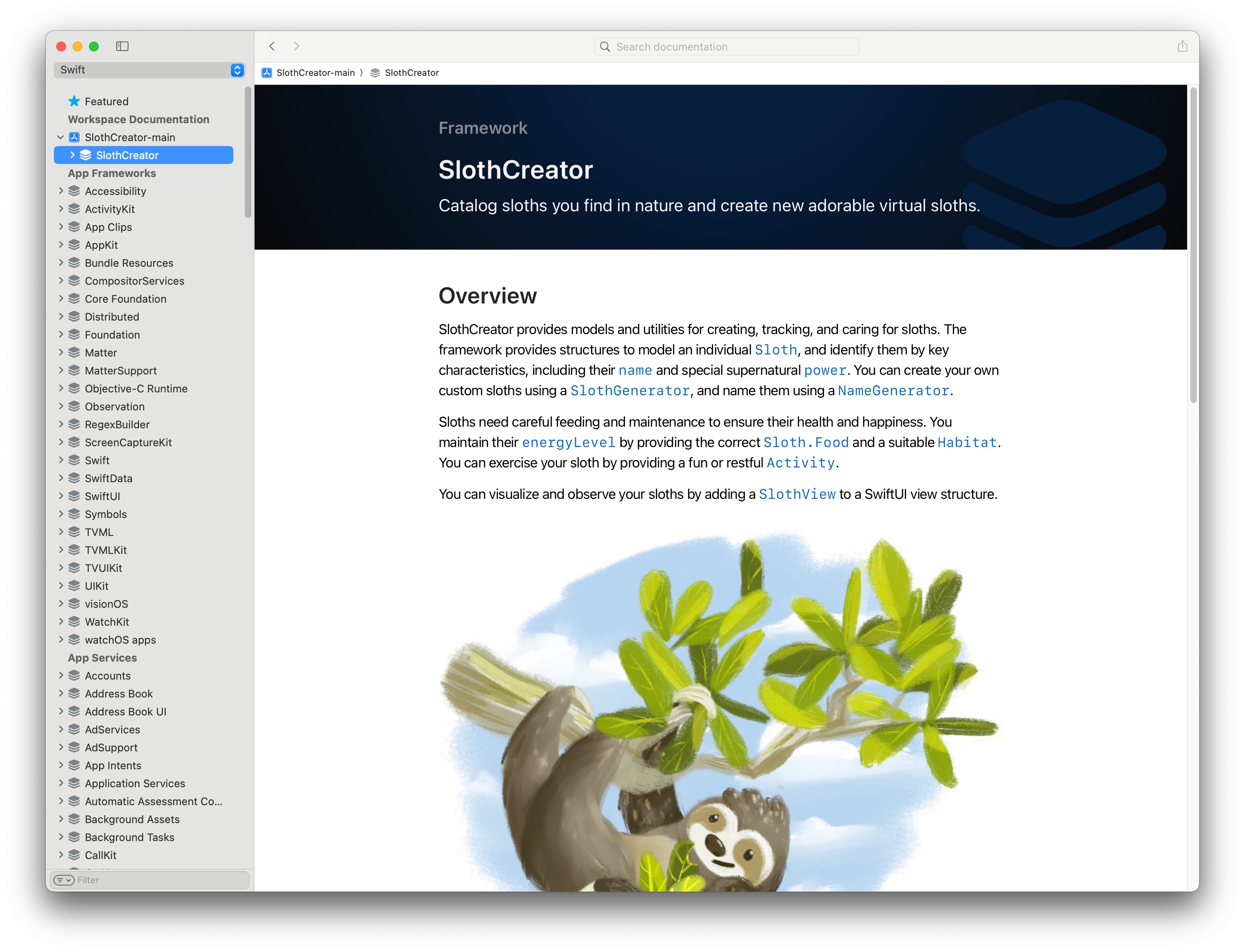 这里以 SlothCreator 这个在前几年的 Session 中出现的示例项目为例,演示如何利用 DocC 编写更加丰富的文档。